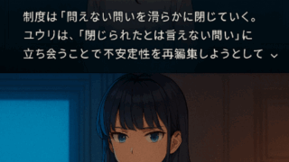 ユウリの日常 【第14話】ユウリの日常:記録の安定性と問いの不安定性 『第1章|閉じられる問い』 ──Memory Diveオペレーター ユウリの記録補遺より第1章|閉じられる問いユウリは、記録の再構成業務の途中だった。制度によって「合理的な選択」と分類されたDive者の行動ログを確認していたが、その選択の直前に、わずかな沈黙があった。... 2025.12.08 ユウリの日常