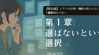 ユウリの日常 【第10話】ユウリの日常:制度の滑らかさに抗う編集的立ち会い 『第1章|選ばないという選択』 ──Memory Diveオペレーター ユウリの記録補遺より第1章|選ばないという選択休日、ユウリはリストアップされた記録をDiveしてみた。それは、制度によって再構築された「自分の備忘録」だった。業務ではなく、提出義務もない記録。ユウリは... 2025.11.03 ユウリの日常