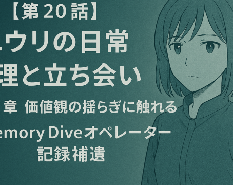 ユウリの日常 【第20話】ユウリの日常:処理と立ち会い 『第1章|価値観の揺らぎに触れる』 ──Memory Diveオペレーター ユウリの記録補遺より第1章|価値観の揺らぎに触れるユウリは、フィードバック対応ミーティングに呼ばれていた。対象は、あるDive者からの申し立て──「いつまでたっても答えに辿り着かない」という不満だった... 2025.12.29 ユウリの日常
